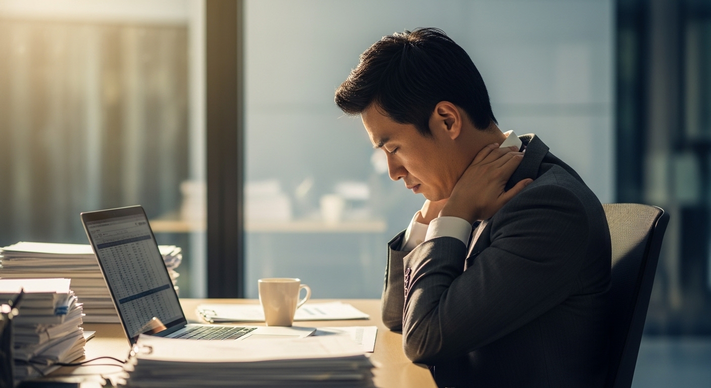 パソコン作業が多い男性は、肩こりや首の痛み、目の疲れに悩まされています...