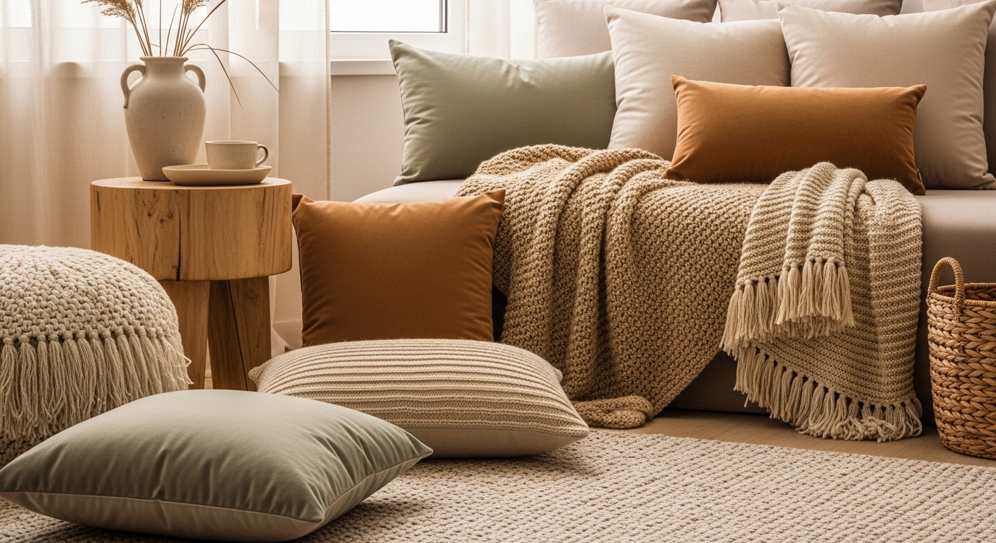 クッションカバー(約1,000円〜)を2〜3枚、アースカラーで揃えるのも効果的です。