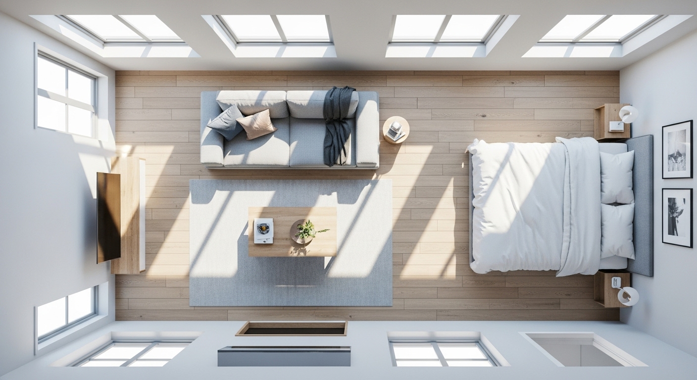 家具を壁際に寄せ、部屋の中央に空間を作ると、視覚的な圧迫感が減ります。