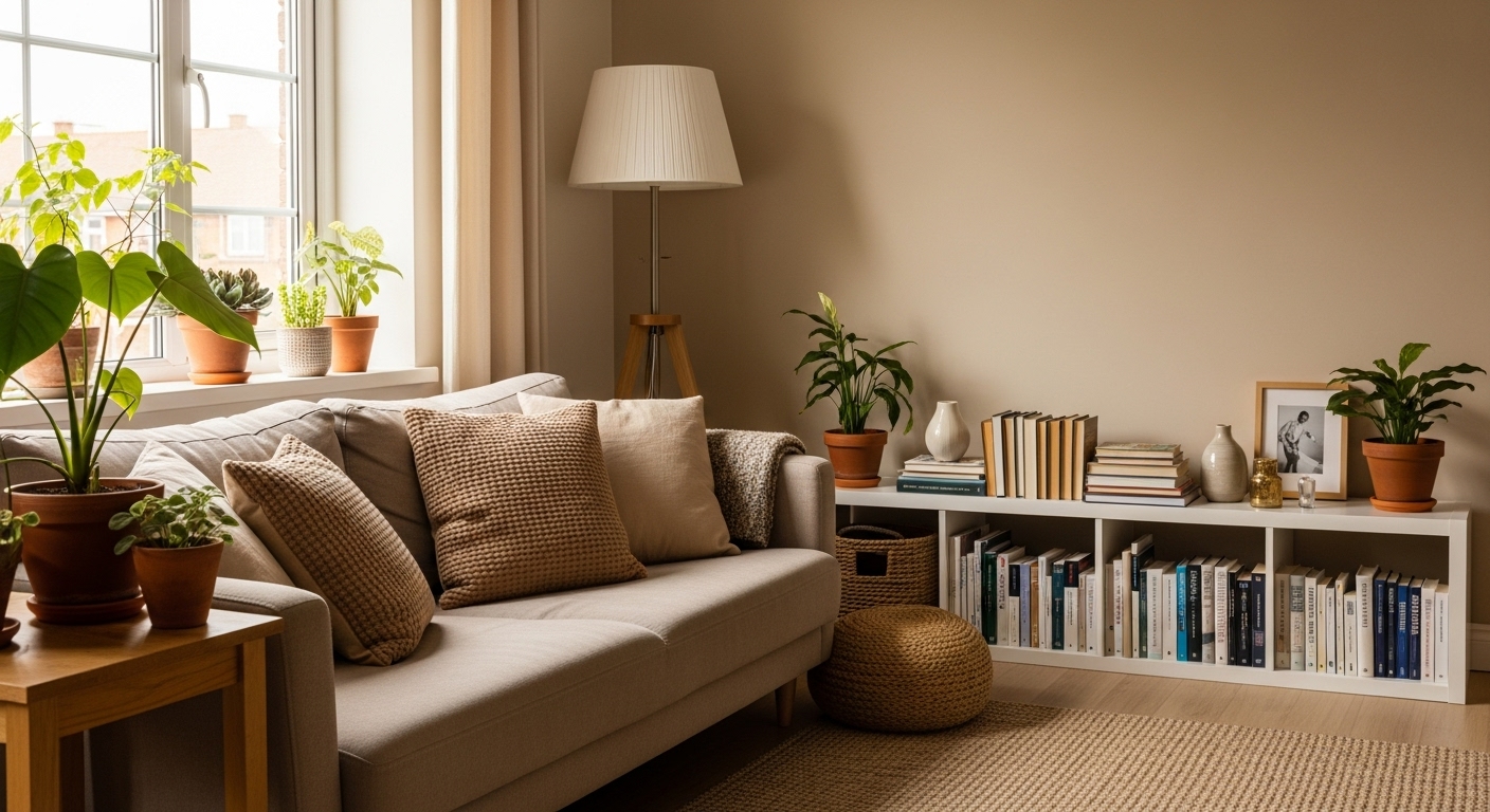 ラグ(約10,000円〜)、ブランケット数枚(約5,000円〜)、観葉植物(約3,000円〜)、照明器具(約10,000円〜)を揃えると、部屋全体の印象が変わります。
