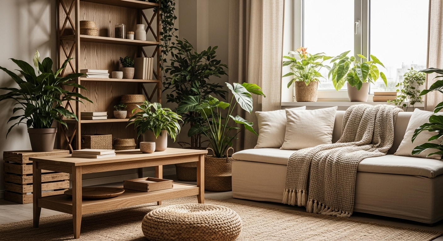 既に家具がある場合でも、小さな木製のトレイや雑貨を取り入れるだけで、自然の温もりを感じられます。
