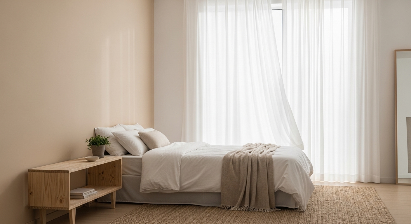 例:ベージュの壁 + 淡いブラウンのカーテン + オフホワイトの寝具