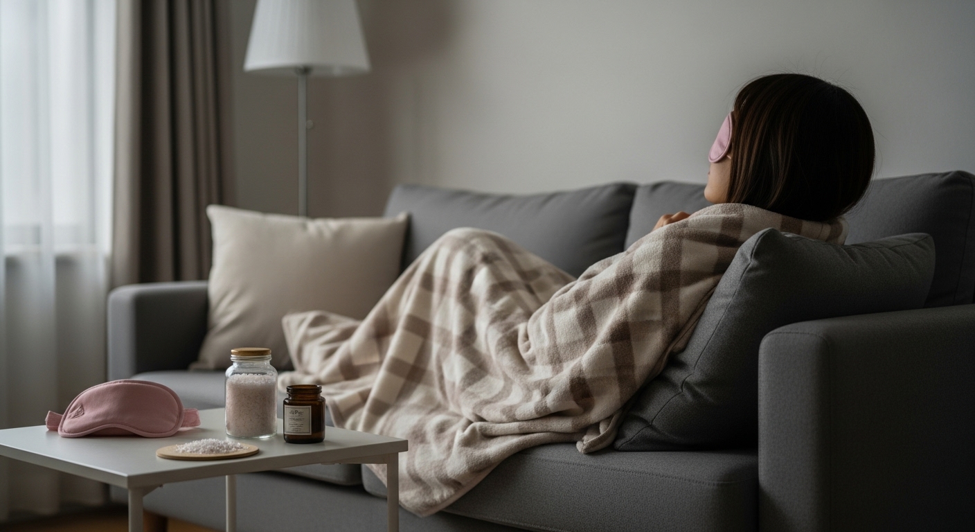 ホットアイマスクの温もり、ブランケットに包まれる感触。