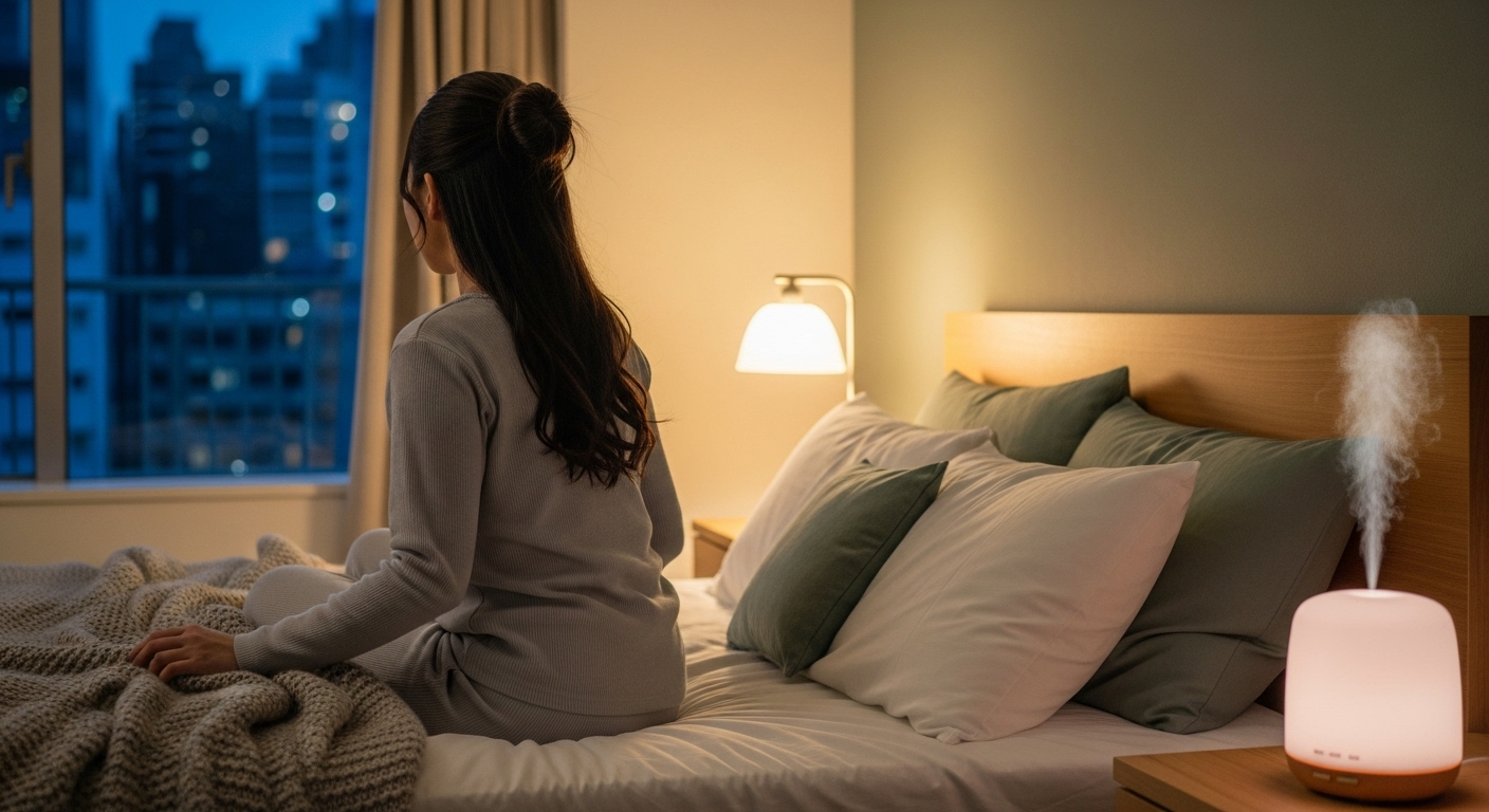 ピローミストを枕に吹きかけて、香りの中で眠る準備をします。