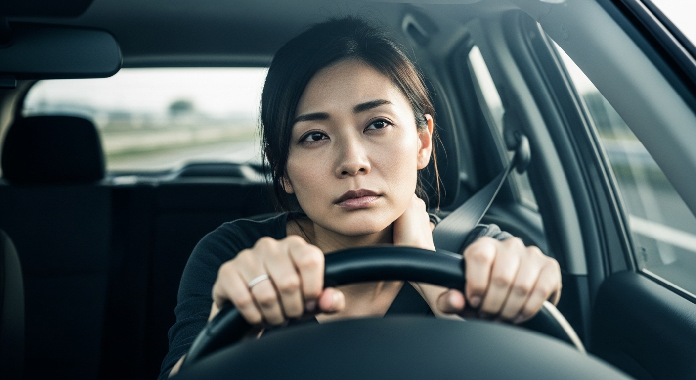 運転中は、ハンドルを握って前を向いた姿勢を保ち続けなければなりません。