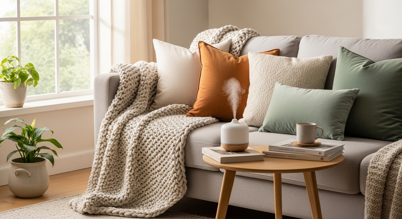 ふわふわのブランケットや、体にフィットする枕は、触れているだけでリラックスできる代表的なアイテムです。